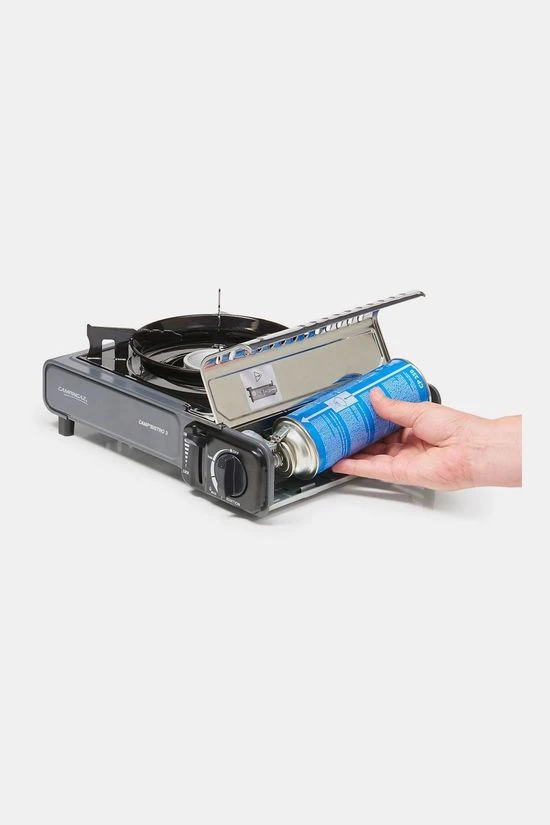 - Te gebruiken met de Campingaz CP250 gas cartouche – dit zijn die langwerpige blauwe met een rode dop (formaat slagroomspuit).